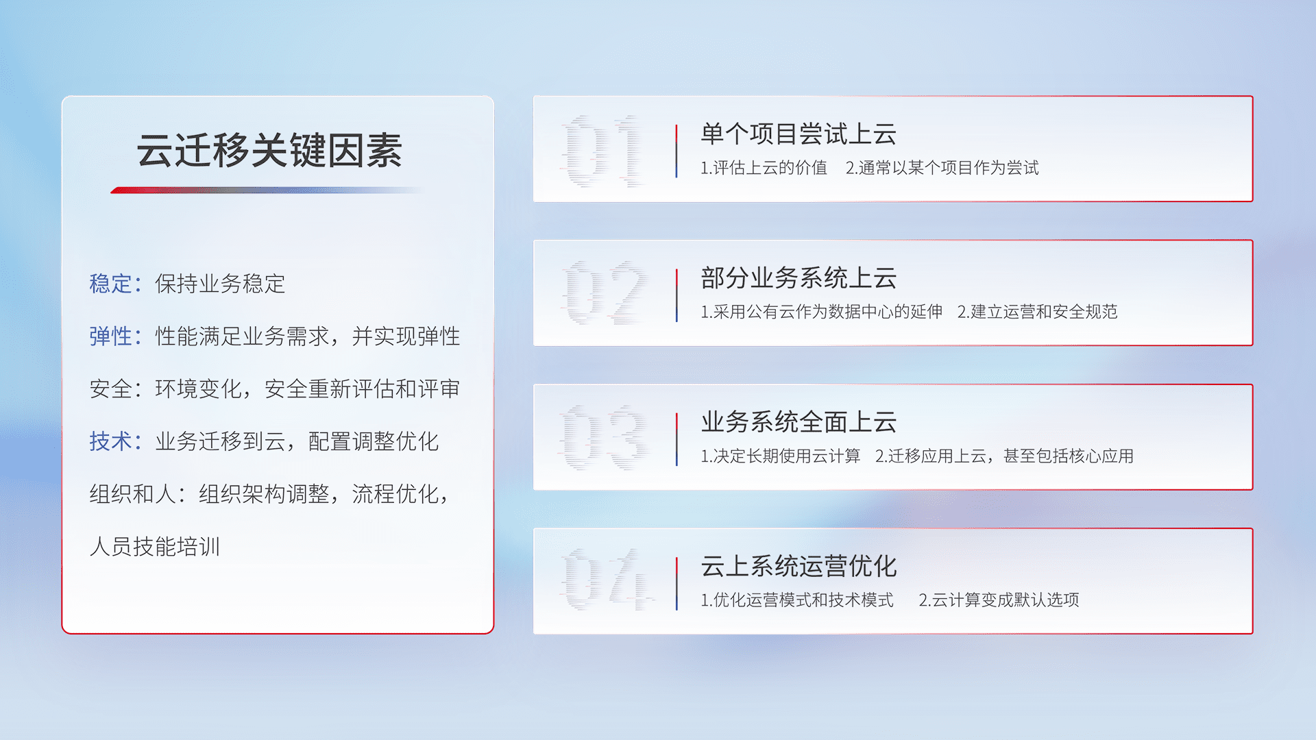 结合实际业务,,,,从规划设计、、云平台选型、、、云原生改造、、、、数据迁移、、集成交付,,,,迁移全过程为客户识别最佳上云路径,,做好风险识别管理,,,设计网络架构、、、身份权限、、、安全审计合规、、、操作审计、、、日志审计、、、监控告警策略、、、多站点容灾设计等,,,对云上基础设施进行整体规划,,提升IT治理水平,,,以满足弹性、、、、高可用、、、高性能的需求。。。
